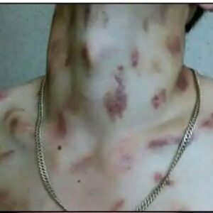 The individuals in the image appear to have multiple reddish-purple bruises, particularly on their necks and upper chests. These marks resemble hickeys (love bites), which are caused…